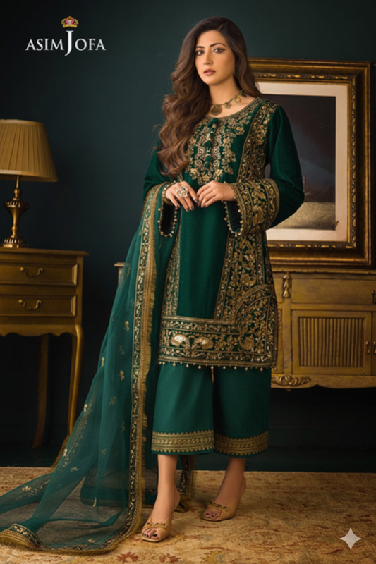 Asim Jofa Velvet | Blue & Green Embroidered 3-Piece Suit | Stitched